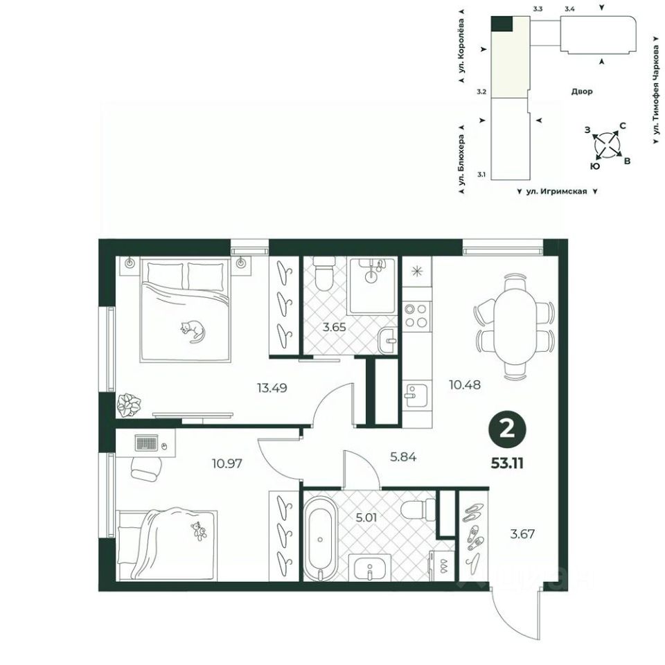 Двухкомнатная квартира с мастер-спальней, обустроенной санузлом. Площадь ванной комнаты позволяет установить стиральную и сушильную машины. В прихожей есть ниша под шкаф. Окна выходят на две стороны.