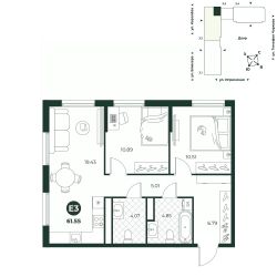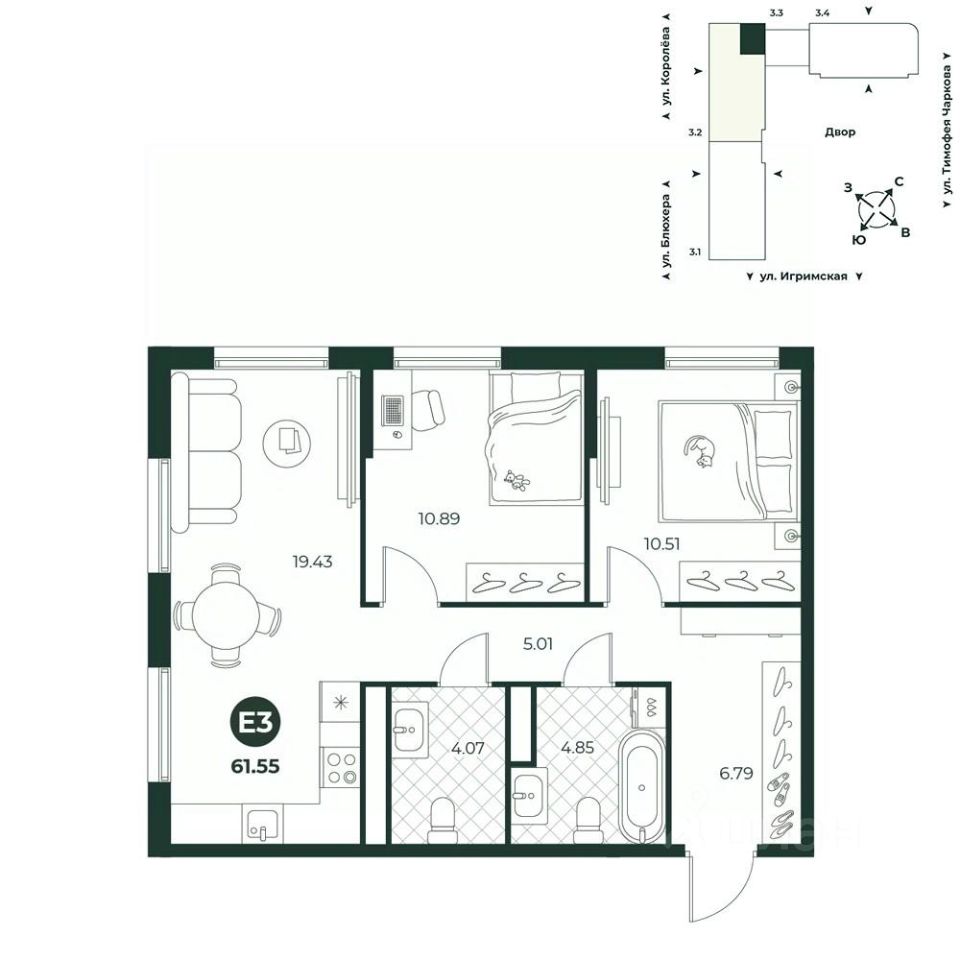 Евротрехкомнатная квартира с двумя санузлами и просторной кухней-гостиной, в которой поместится большая компания за праздничным столом. В прихожей можно установить шкаф для одежды. Окна выходят на две стороны.