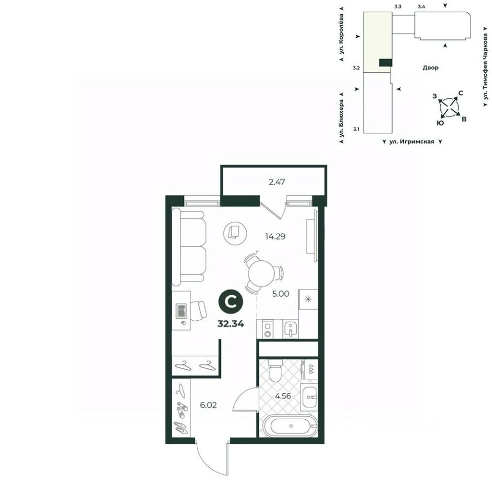 Уютная студия с французским балконом — это функциональное пространство, наполненное естественным светом, которое идеально подходит для молодых семей. Окна выходят во двор. В прихожей есть ниша под шкаф.