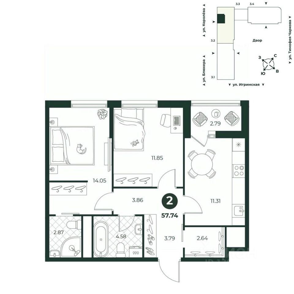 Двухкомнатная квартира с мастер-спальней, оборудованной гардеробной и санузлом, отлично подойдет для семей с детьми, поскольку обеспечивает родителям уединение и комфорт. В кухне есть выход на лоджию, а в прихожей- полноценная зона для организации системы хранения.
