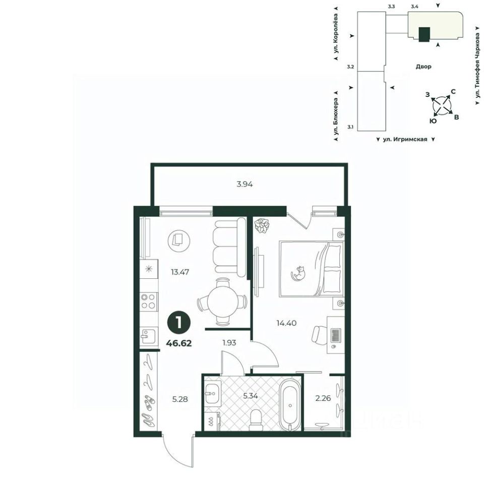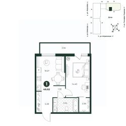 Классическая однокомнатная квартира с мастер-спальней, оборудованной гардеробной и выходом на собственную террасу, на которой можно обустроить уютную зону отдыха с мебелью для релаксации. В прихожей есть место для организации системы хранения. Окна выходят во двор.