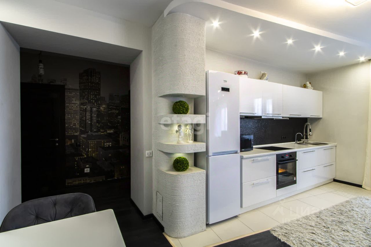 В комплекте красивый кухонный гарнитур и встроенная техника, которые остаются новому владельцу.
