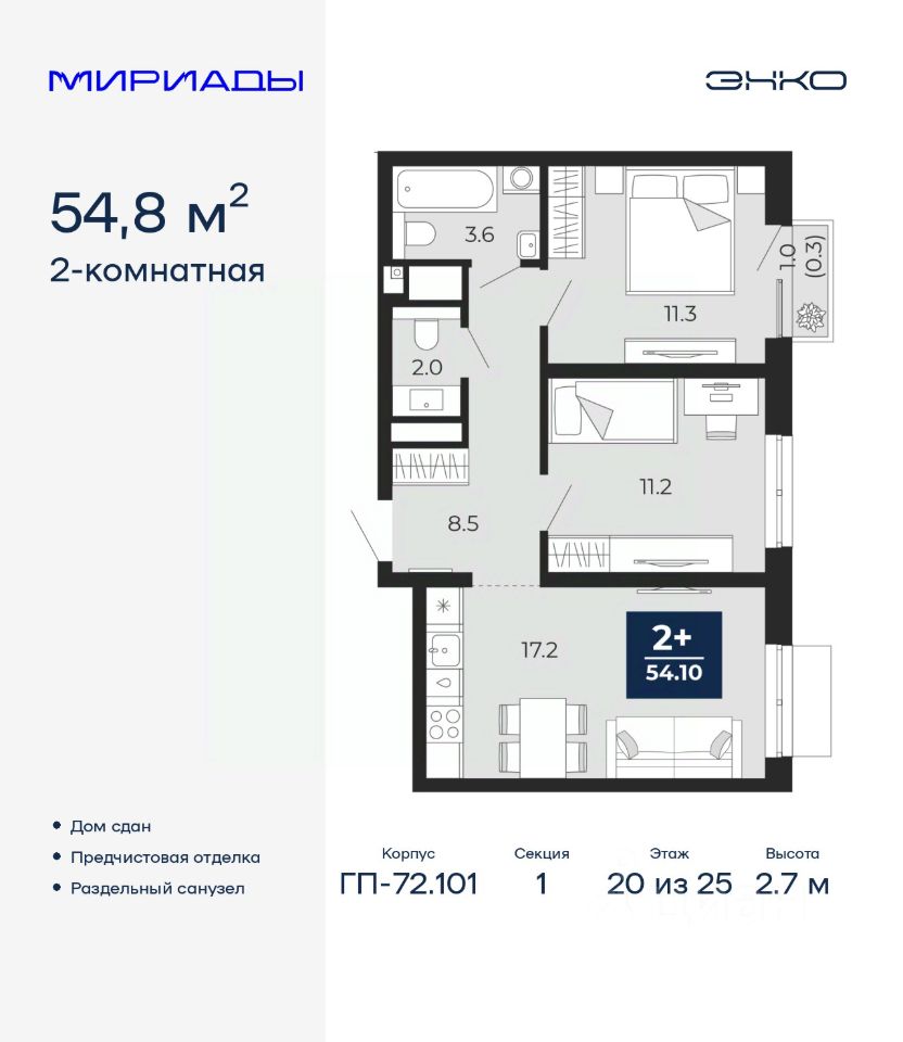 2-комн. квартира от застройщика с предчистовой отделкой в ЖК "Мириады" на 20 этаже. Общая площадь: 54.8 кв.м. Высота потолков 2.7 м.