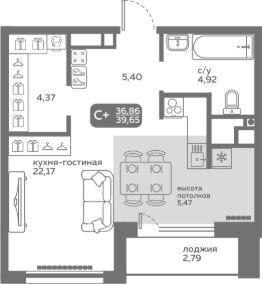 Прямая продажа от застройщика! Продается студия в строящемся ЖК "Меридиан Слобода", срок сдачи: I-кв. 2027, общей площадью 36.86 м², на 20 этаже из 20. Площадь кухни — 22.17 м².