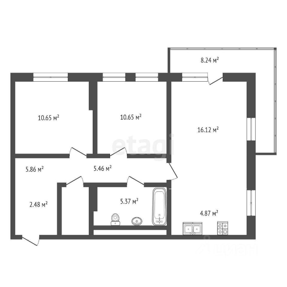 Функциональная планировка: окна кухни-гостиной площадью 21 кв.м. выходят на две смежные стороны, две изолированные спальни по 10,65 кв.м., просторный санузел площадью 5,37 кв.м.