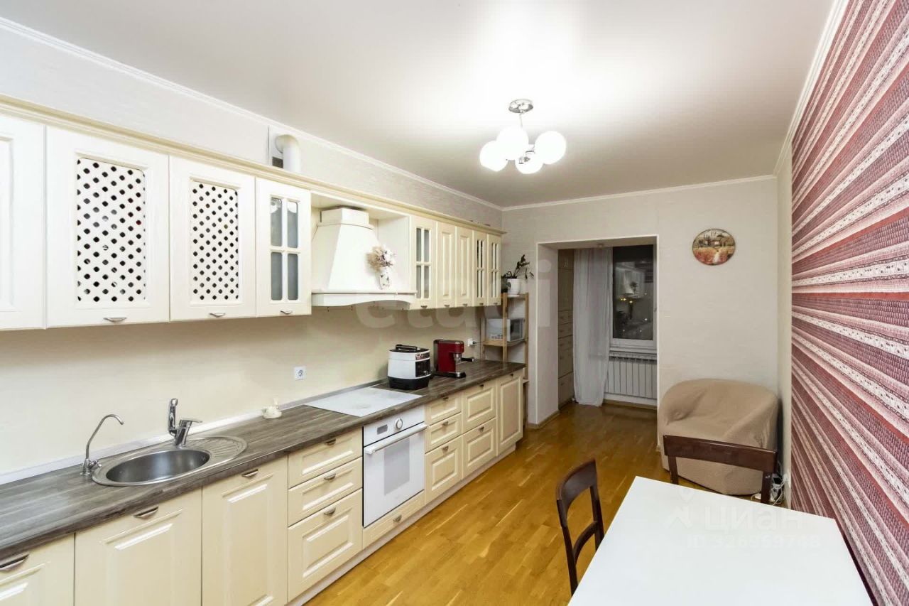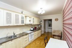 При продаже остается кухонный гарнитур, вытяжка, варочная панель, духовой шкаф, обеденный стол, маленький телевизор, стиральная машина, зона хранения в гардеробной.