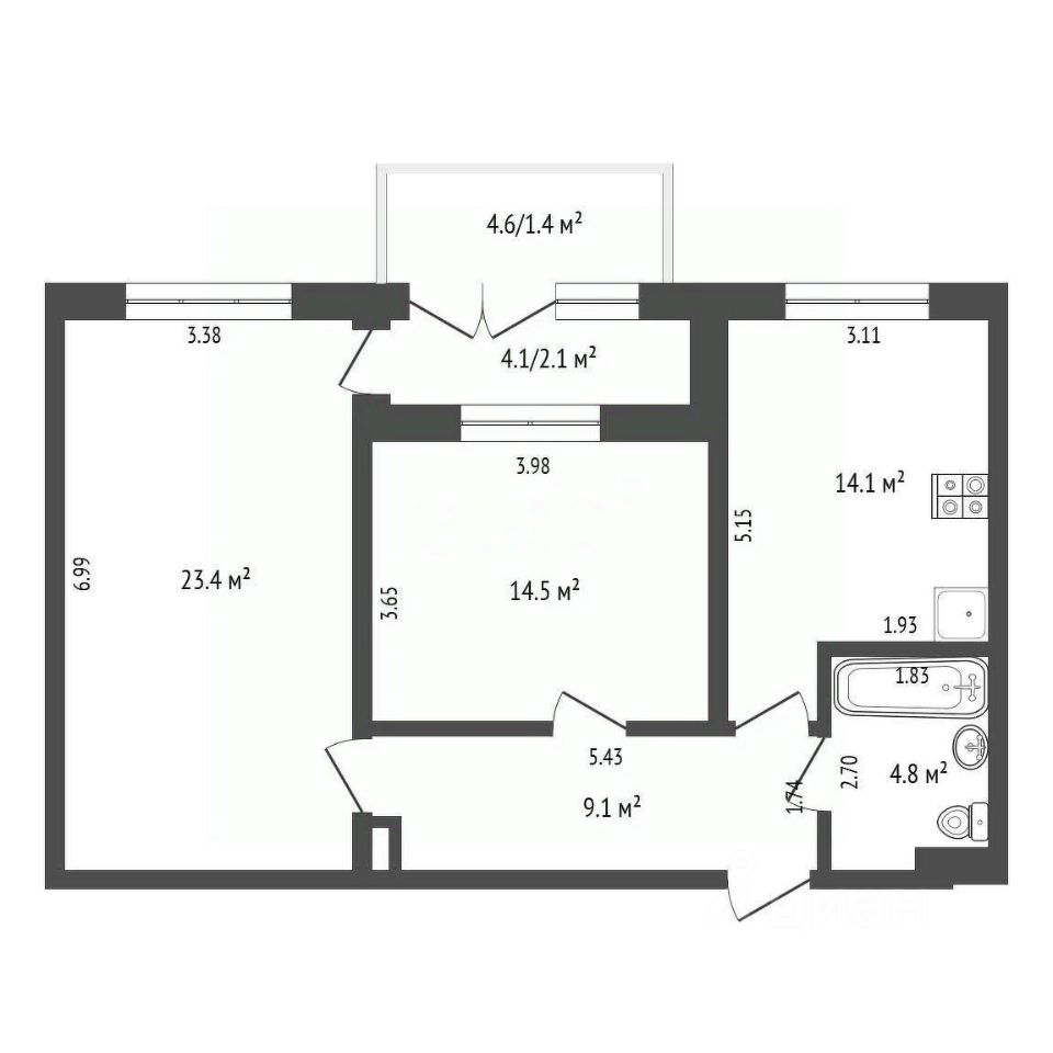 Общая площадь - 66,2 кв.м., лоджия - 4,1 кв.м., балкон - 4,6 кв.м