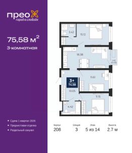 Успейте оформить бронирование на этих условиях, срок акции ограничен! Стоимость квартиры указана со скидкой, ваша экономия составит 500,000 руб. Информация по телефону, наши менеджеры вам все расскажут. Продается трехкомнатная квартира с предчистовой отделкой в ЖК "Прео" на 5 этаже. Общая площадь: 75.58 кв.м. Высота потолков 2.7 м. Дом монолитный, трехподъездный, переменной этажности, от 14 до 22 этажей. Квартира находится в 3-й секции высотой 14 этажей в корпусе 208. На этаже 6 квартир. В подъезде 1 пассажирский и 1 грузовой лифт. Окончание строительства - 1 квартал 2026 года. Оформление сделки по договору долевого участия. Преображенский — один из самых привлекательных районов для жизни! Это полностью самостоятельный жилой район с точки зрения инфраструктуры. Преображенский находится между Московским и Червишевским трактами в квартале улиц Закалужская — Вьюжная — Александра Протозанова. Не нужно ждать, когда появится инфраструктура — переезжайте на всё готовое. Вблизи расположены действующие школа и детский сад. В этом году откроется еще один сад, а в следующем году — школа. По соседству с Преображенским запланировано строительство городского парка "Комарово" площадью 38 гектар. За 10 минут можно доехать на автомобиле до крупных ТРЦ: "Лента", "Кристалл", "Леруа Мерлен", "Метро" и "Ашан". С 2018 года в районе открыт Соседский центр — пространство, созданное для формирования добрососедской среды, совместного досуга, общения и реализации соседских инициатив. Здесь проходят встречи соседей, а также сами жители района организовывают мероприятия. Организатором такого события может стать любой желающий. В квартирах выполнена качественная предчистовая отделка. Гладкие стены с финишным выравниванием по маякам. Ровный потолок для установки натяжного потолка. Установлены пятикамерные окна с двойным стеклопакетом (3 стекла). Дизайнерские холлы с видеонаблюдением, безбарьерным и прозрачным входом всегда светло и спокойно. На первом этаже есть просторные колясочные, где все жители могут оставлять свои коляски и велосипеды. В Преображенском есть всё, что нужно для активного отдыха и занятий спортом. Мы сделали большое футбольное поле с безопасным покрытием. Также установили хоккейный корт, который оборудован по всем необходимым стандартам. Во дворах можно делать упражнения на специальных площадках с турниками. Весь район мы обустроили велодорожками, которые связаны в единый маршрут. У нас есть сухие фонтаны, бьющие из земли, деревья, веревки, сетки, скалодром, газон, песок и резинка — осталось просто дать своему ребенку право на свободную игру. По-настоящему хорошие дворы — это те, которые дети предпочитают соцсетям и телевизору. Аккредитация в банках: ПАО Банк "ВТБ", ПАО "Банк Уралсиб", ПАО "Газпромбанк", ОАО "Альфа-Банк", "Сбербанк России" и других. #26e4t4