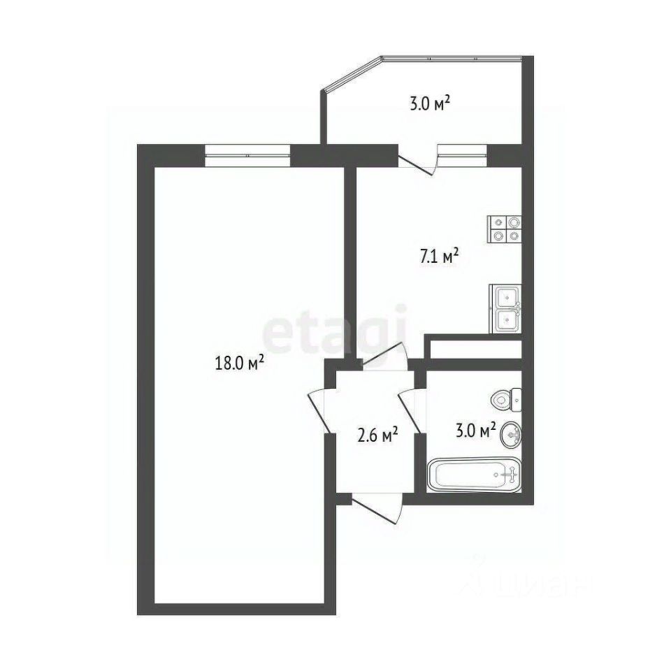 Объект характеризуется рациональной планировкой с изолированной кухней площадью 7.1 кв метр, просторной комнатой площадью 18 кв метров и совмещенным санузлом, что создает комфортные условия для проживания.