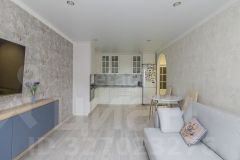 Выполнен современный ремонт: натяжные потолки; во входной зоне и на кухне на полу выложена плитка, в жилых комнатах ламинат; с/у выложен керамической плиткой.
