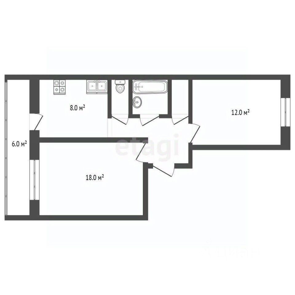 Квартира 48,6 кв.м.- большая гостиная- 18 кв.м.- правильной формы, спальня- 12 кв.м. и кухня - 8 кв.м.