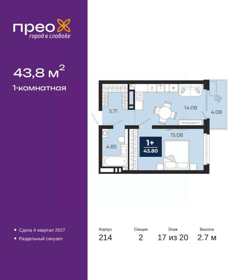 1-комн. квартира с предчистовой отделкой в ЖК "Прео" на 17 этаже. Общая площадь: 43.8 кв.м., жилая: 15.08 кв.м., площадь просторной кухни-столовой: 14.08 кв.м. Все окна выходят на одну сторону. В квартире один балкон, один совмещенный санузел. Высота потолков 2.7 м.