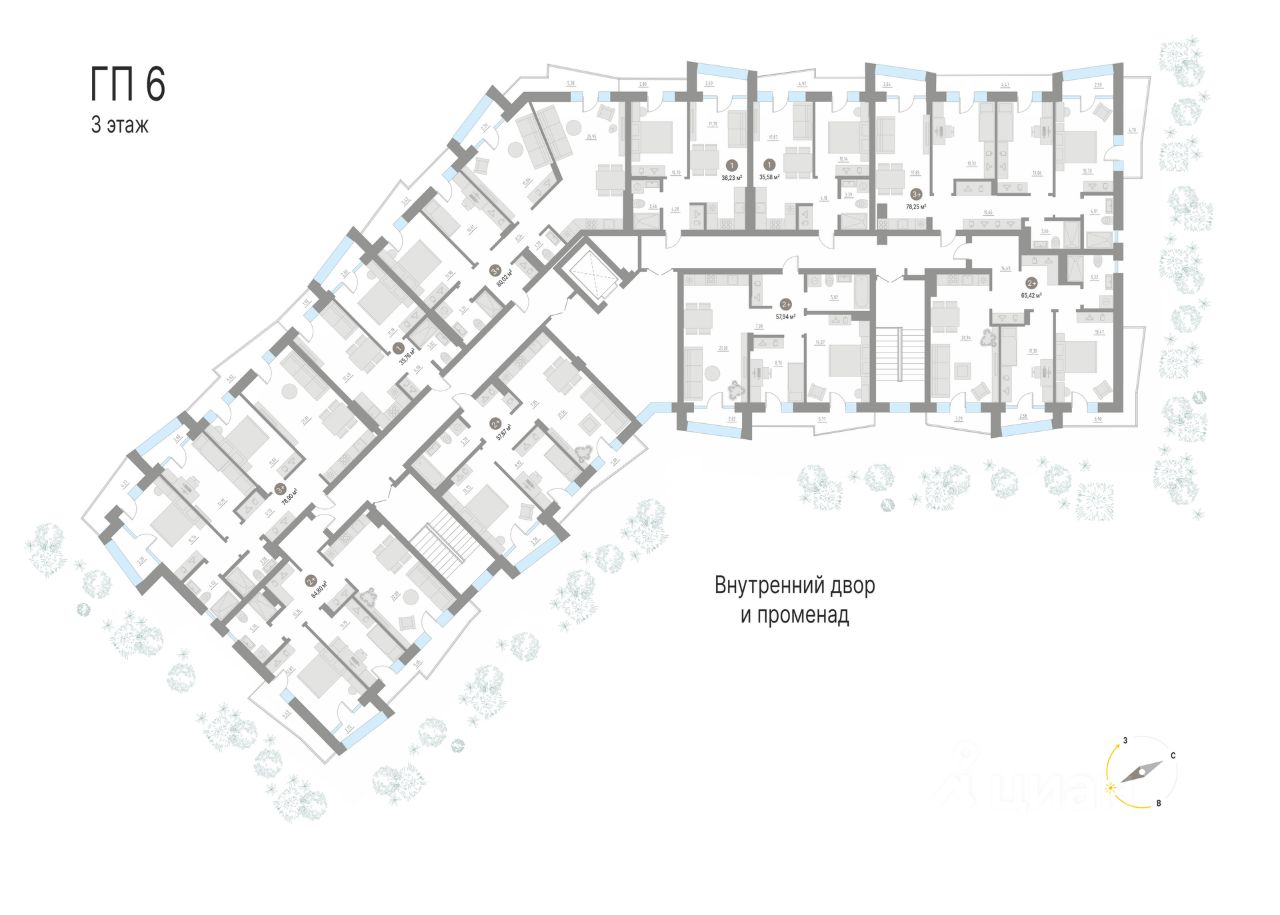 На первых этажах зданий расположены квартиры с террасами, на верхних этажах —