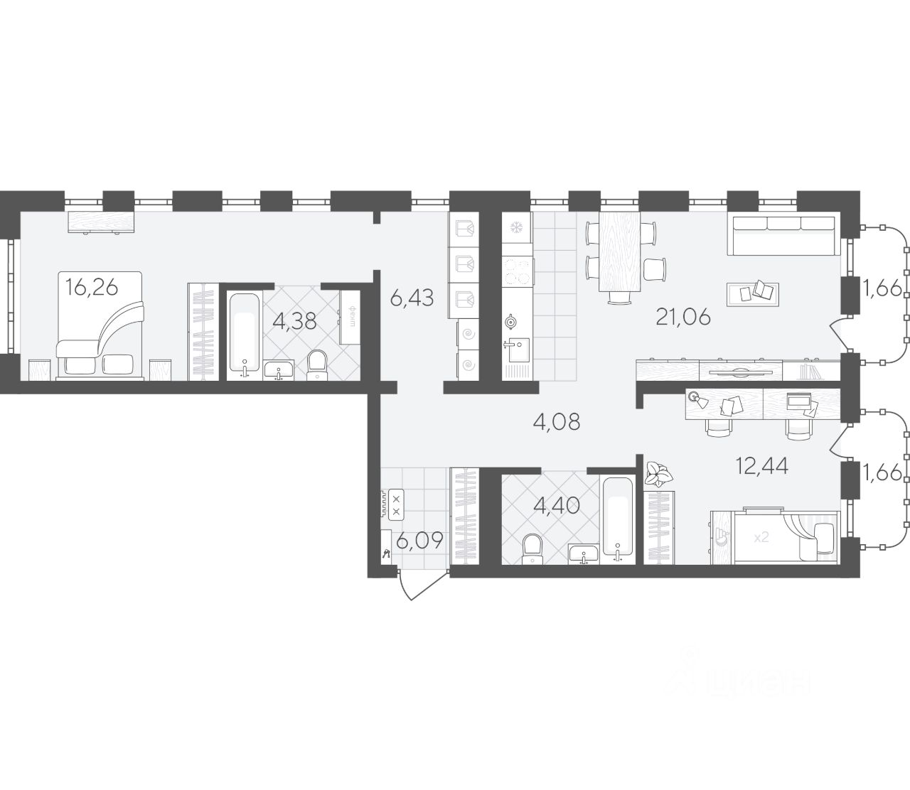 Квартира с 2 спальнями площадью 78,46 кв.м