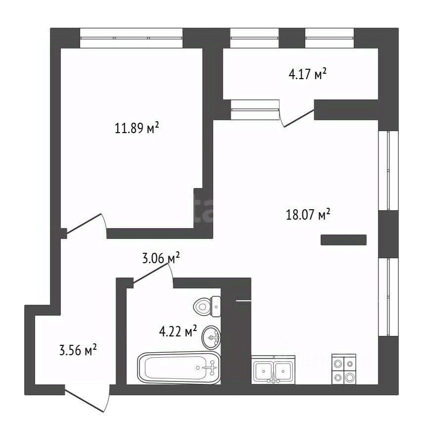 Планирoвка: компактный коридор с нишей для шкафа, просторная кухня-гостиная 18,07 кв.м. с выходом на лоджию 4,17 кв.м, изолированная комната 12 кв.м., санузел с ванной.