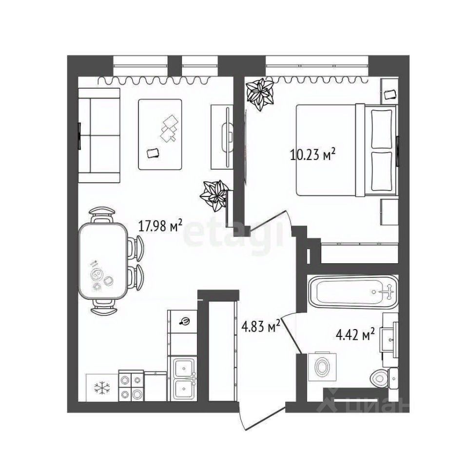 Общая площадь составляет 37,46 кв. м. Просторная и функциональная кухня-гостиная: 17,98 кв. м.