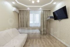 В квартире выполнен современный ремонт: в санузле кафель, на стенах качественные обои, на полу ламинат хорошего качества, потолки натяжные, окна пластиковые.