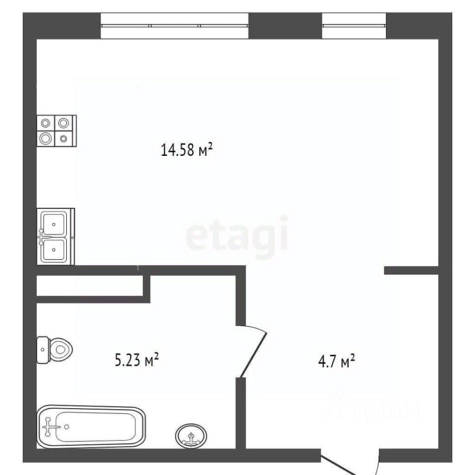 Большая комната имеет 2 окна, что позволяет при необходимости зонировать пространство на обеденную зону и зону отдыха.