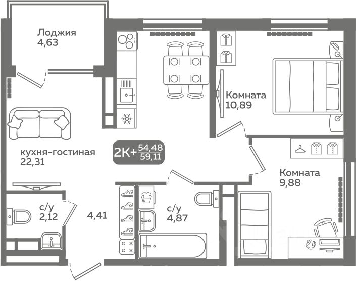 Прямая продажа от застройщика! Продается двухкомнатная квартира в строящемся ЖК "Меридиан Слобода", срок сдачи: I-кв. 2027, общей площадью 54.48 м², на 13 этаже из 21. Площадь кухни — 22.31 м².
