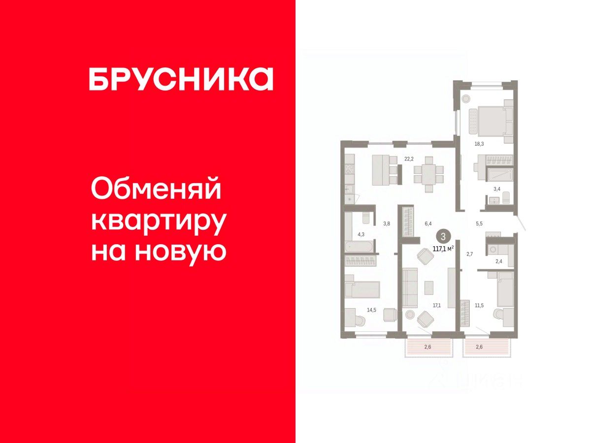 3-комн. квартира с предчистовой отделкой в ЖК "Зарека" на 9 этаже. Общая площадь: 117.05 кв.м. Высота потолков 2.7 м.