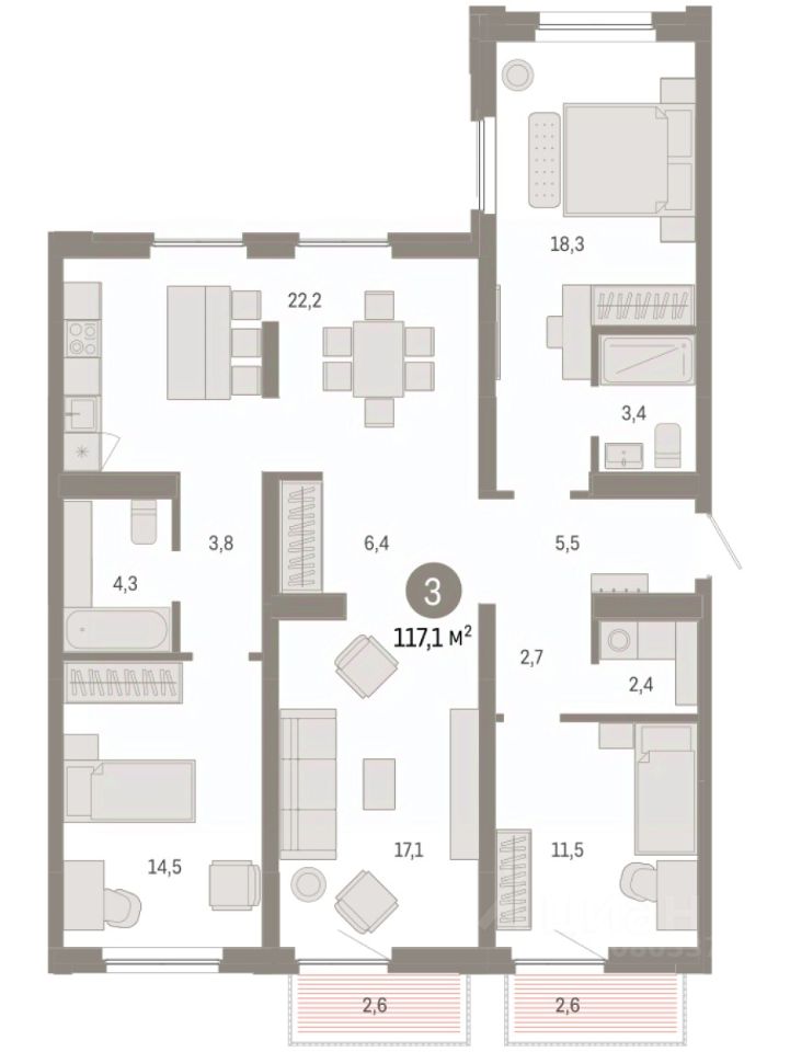 Квартира с кухней-гостиной и тремя спальнями в жилом районе "Зарека". Особенности планировки: балкон, мастер-спальня, постирочная, предчистовая отделка, разнесённые спальни.