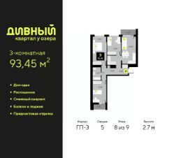 Продается 3-комн. квартира с предчистовой отделкой в ЖК "Дивный квартал у озера" на 8 этаже. Общая площадь: 93.45 кв.м., жилая: 46.25 кв.м., площадь просторной кухни-столовой: 19.57 кв.м. Квартира - распашонка, без проходных комнат, окна выходят на paзные стороны дома. В квартире один балкон и одна лоджия, один совмещенный санузел. Высота потолков 2.7 м.