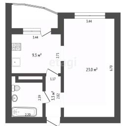 * Просторная комната 22,4 м², кухня 9,3 м², застекленный балкон 3,7 м².