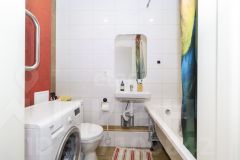 - стены выровнены под маяк и оклеены обоями светлых тонов, на полу качественный ламинат, потолок натяжной с точечными светильниками, стены и пол в санузле выложены кафелем;