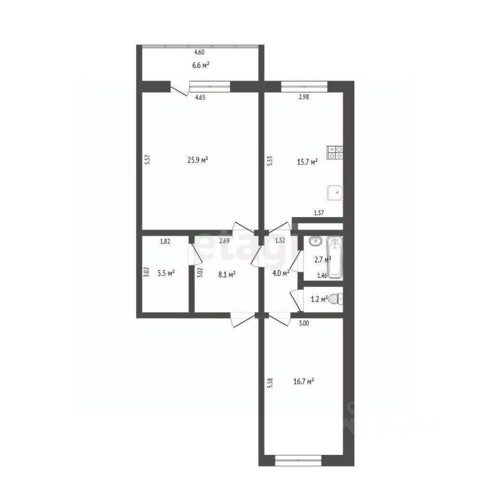В квартире сделан свежий современный ремонт. В цене остаются кухонный гарнитур и встроенная техника. Также есть вместительная гардеробная, которая станет отличным дополнением для хранения вещей.