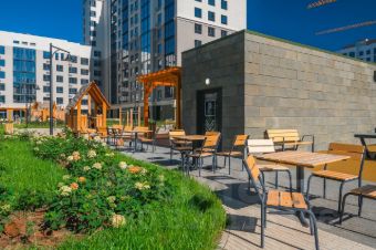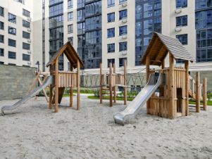 В закрытом дворе находятся детские и спортивные площадки, где дети смогут активно проводить время на свежем воздухе. Он поделен на две зоны: активная, где располагаются детские площадки для разных возрастов и место для спорта с большим теннисным кортом, тихая зона для отдыха и созерцания с природой. Безопасность на территорий жилого комплекса обеспечивается закрытой территорией, видеонаблюдением.
