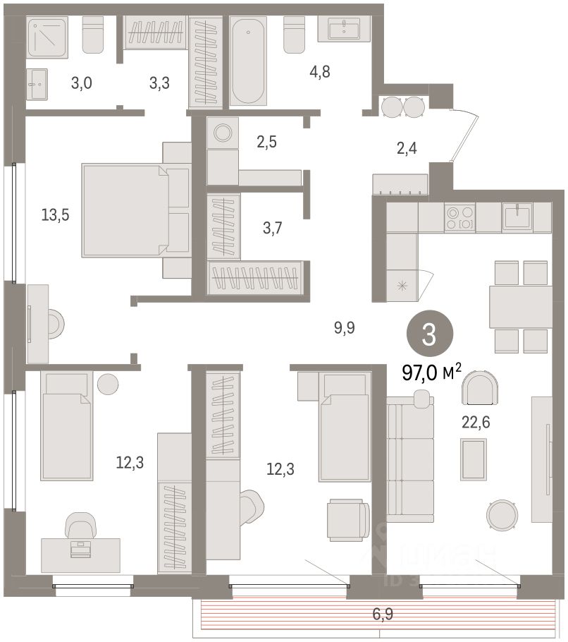 Просторная трехкомнатная квартира с предчистовой отделкой в ЖК "Зарека" на 10 этаже. Общая площадь: 97.03 кв.м. Высота потолков 2.7 м.
