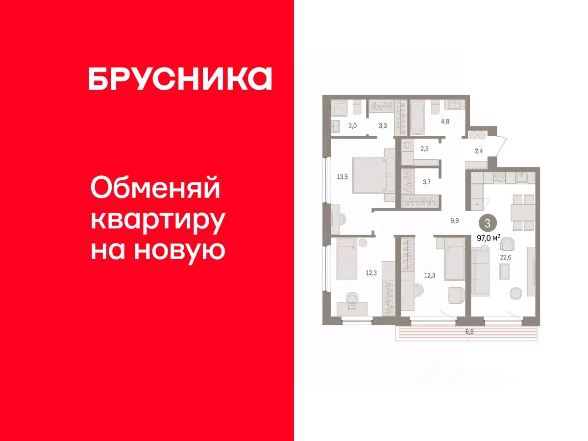Квартира с кухней-гостиной и тремя спальнями в жилом районе "Зарека". Особенности планировки: вид во двор, второй санузел, гардеробная, мастер-спальня, постирочная, предчистовая отделка, разнесённые спальни, терраса на крыше.
