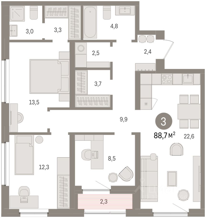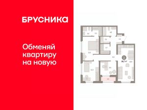 Квартира с кухней-гостиной и тремя спальнями в жилом районе "Зарека". Особенности планировки: вид во двор, второй санузел, гардеробная, лоджия, мастер-спальня, окна в пол, постирочная, предчистовая отделка, разнесённые спальни.