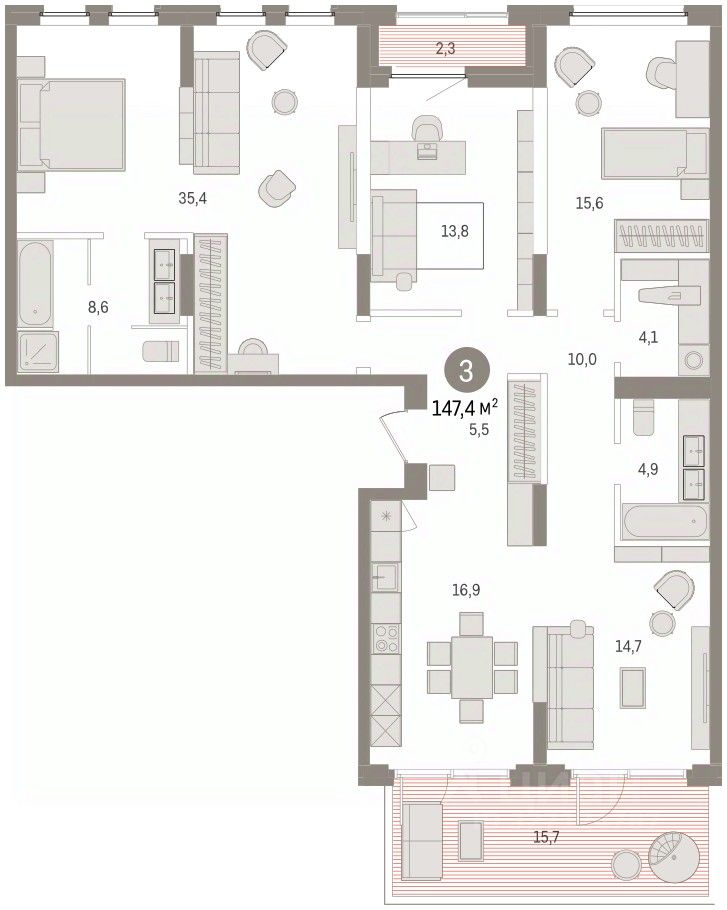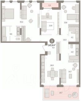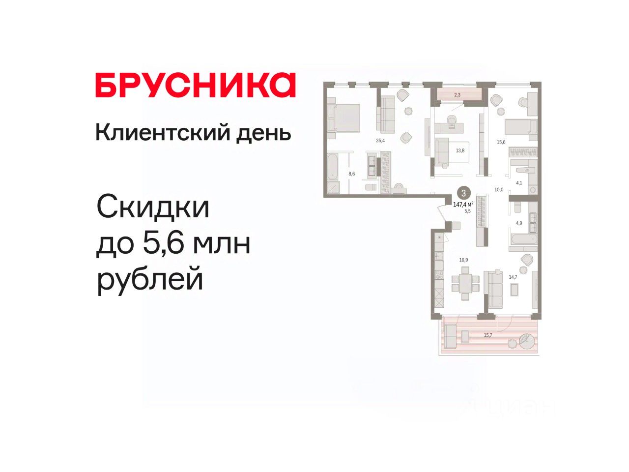Просторная 3-комн. квартира с предчистовой отделкой в ЖК "Зарека" на 2 этаже. Общая площадь: 147.38 кв.м. Высота потолков 2.7 м.