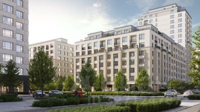 Замкнутый квартал высотой 8 этажей с 16-ти этажной башней-доминантой и двором на стилобате двухуровневого паркинга.