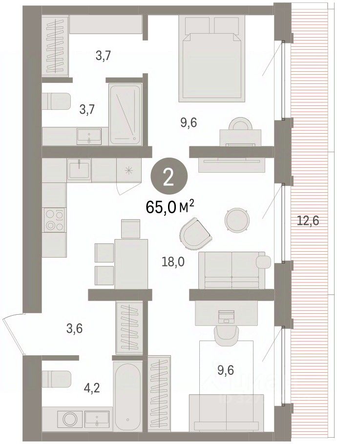 Квартира с кухней-гостиной и двумя спальнями в жилом районе "Зарека". Особенности планировки: второй санузел, гардеробная, мастер-спальня, предчистовая отделка, разнесённые спальни, терраса на крыше.