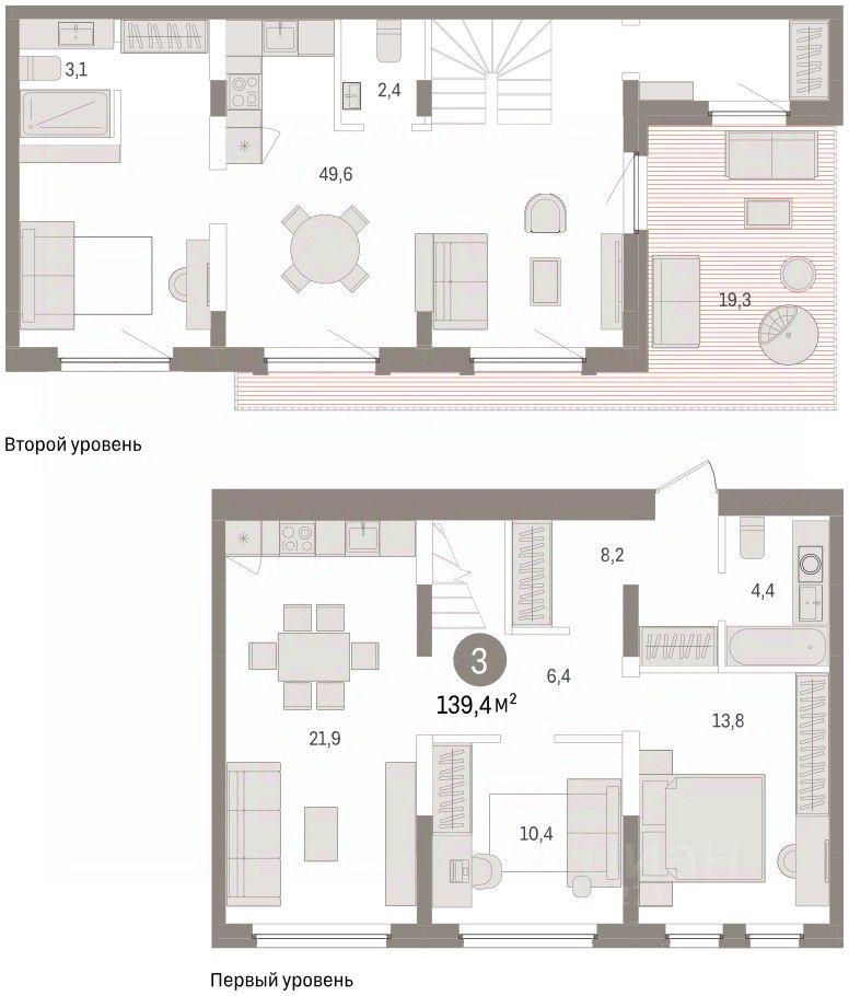 Квартира с кухней-гостиной и двумя спальнями в жилом районе "Зарека". Особенности планировки: второй санузел, летняя кухня на крыше, окна в пол, разнесённые спальни, свободная планировка, терраса на крыше.