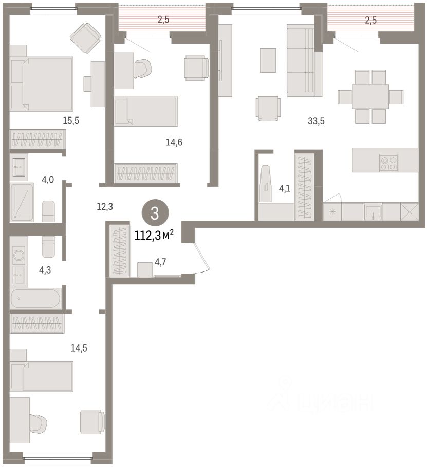 Квартира с кухней-гостиной и тремя спальнями в жилом районе "Зарека". Особенности планировки: вид во двор, второй санузел, лоджия, мастер-спальня, окна на две стороны, постирочная, предчистовая отделка, разнесённые спальни.