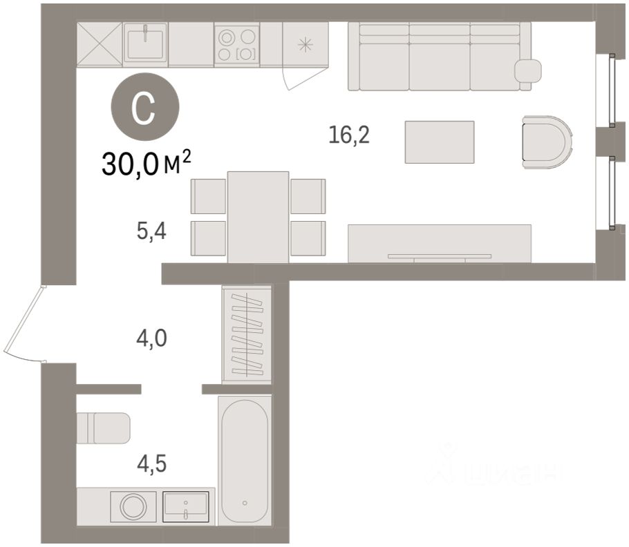 Однокомнатная студия с предчистовой отделкой в ЖК "Зарека" на 6 этаже. Общая площадь: 30 кв.м., площадь гостиной 21.5 кв.м., из которых 5 кв.м. выделено под кухонную зону. Все окна выходят на одну сторону. В квартире один совмещенный санузел. Высота потолков 2.7 м.