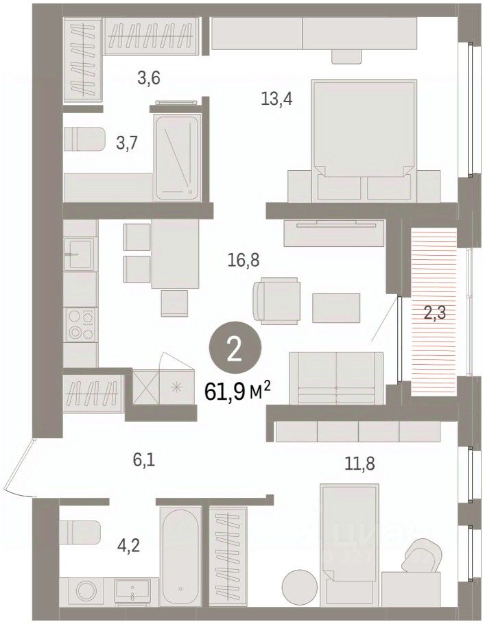 2-комн. квартира с предчистовой отделкой в ЖК "Зарека" на 4 этаже. Общая площадь: 61.9 кв.м. Высота потолков 2.7 м.