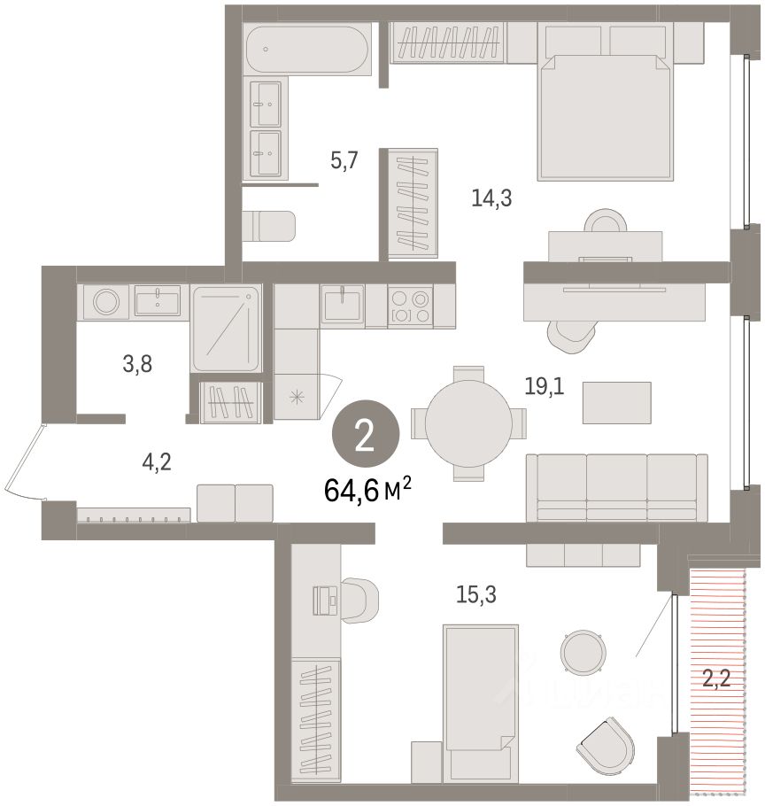 Квартира с кухней-гостиной и двумя спальнями в жилом районе "Зарека". Особенности планировки: второй санузел, лоджия, мастер-спальня, предчистовая отделка, разнесённые спальни.