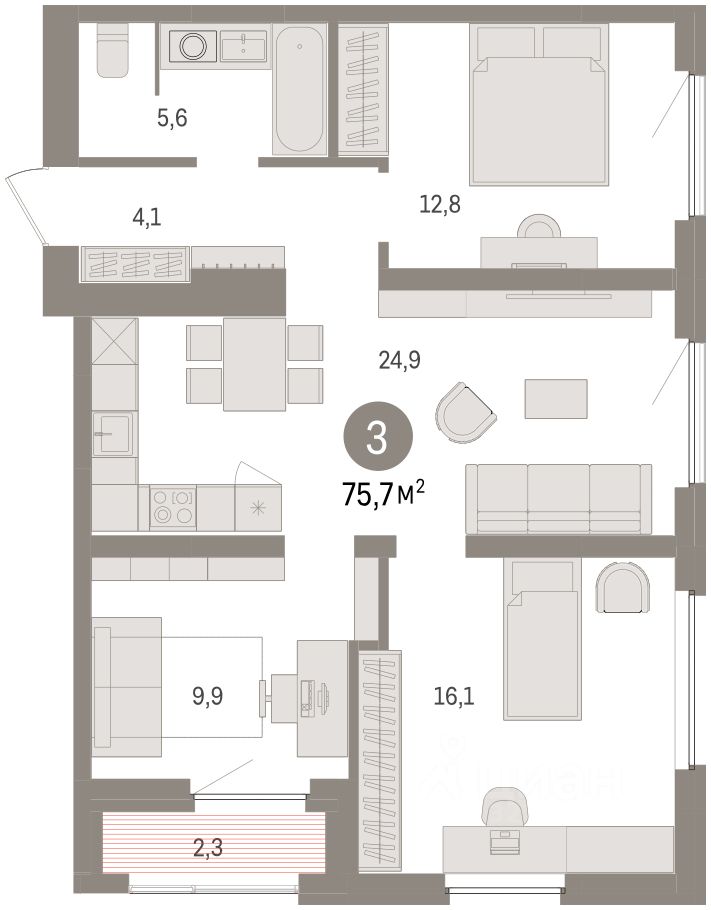Квартира с кухней-гостиной и тремя спальнями в жилом районе "Зарека". Особенности планировки: лоджия, окна в пол, предчистовая отделка, разнесённые спальни.
