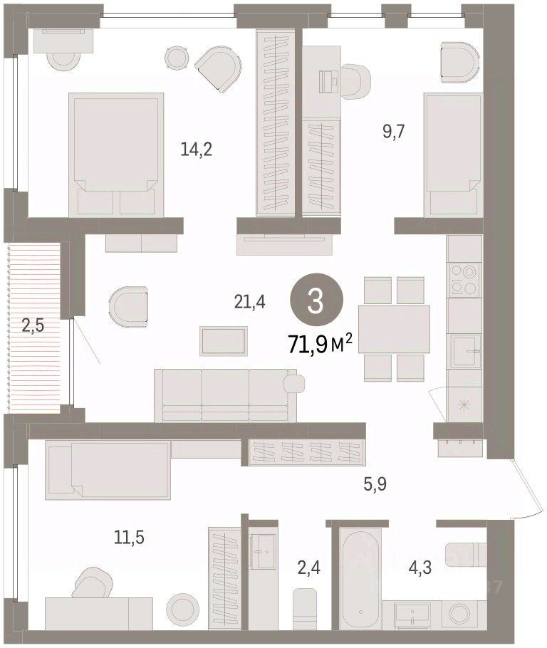 Квартира с кухней-гостиной и тремя спальнями в жилом районе "Зарека". Особенности планировки: вид во двор, второй санузел, лоджия, предчистовая отделка, разнесённые спальни.