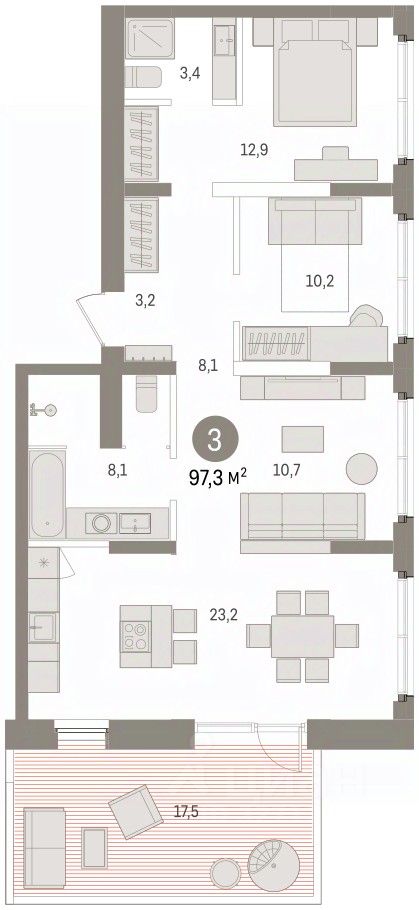 Квартира с кухней-гостиной и тремя спальнями в жилом районе "Зарека". Особенности планировки: вид во двор, второй санузел, гардеробная, окна в пол, панорамное остекление, разнесённые спальни, свободная планировка, терраса.