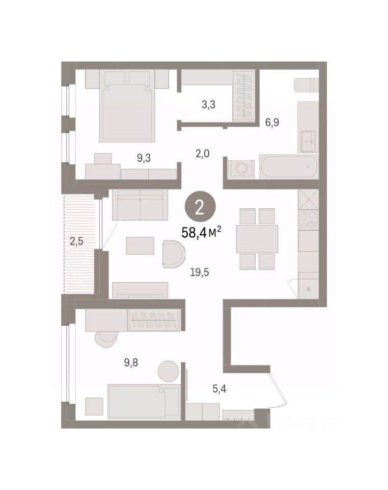 Квартира с кухней-гостиной и двумя спальнями в жилом районе "Зарека". Особенности планировки: вид во двор, гардеробная, лоджия, предчистовая отделка, разнесённые спальни.