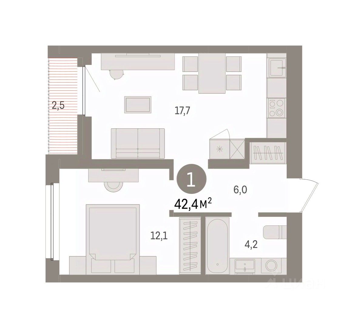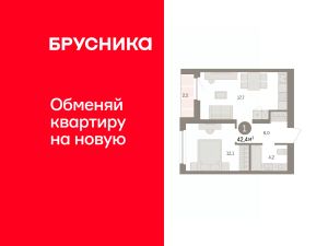 Просторная однокомнатная квартира с предчистовой отделкой в ЖК "Зарека" на 8 этаже. Общая площадь: 42.42 кв.м. Высота потолков 2.7 м.