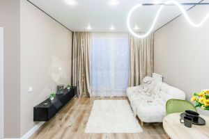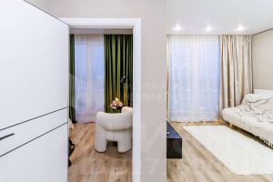 Высота и свет: Потолки 2,7 м высокие плинтусы из МДФ скрытые карнизы. Шторы ложатся идеальными складками, создавая интерьер журнального уровня.