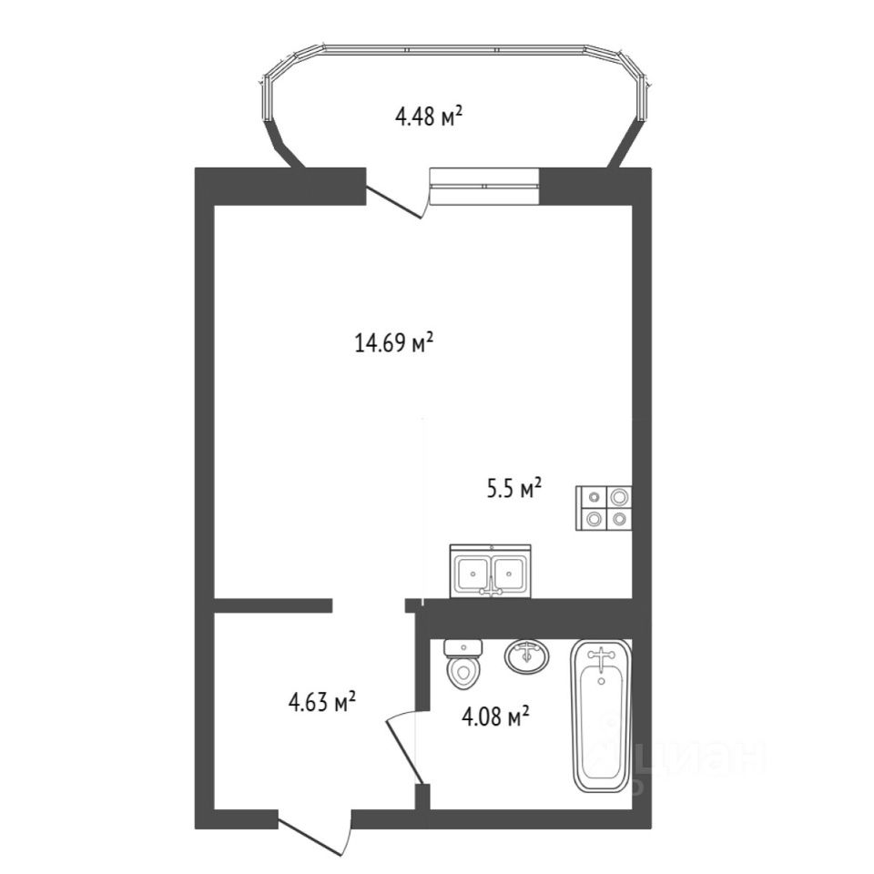 Просторная кухня-гостиная — 14,69 м² (легко зонируется на кухню и зону отдыха)
