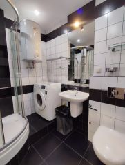 Огромная ванная комната оснащена душевой кабиной и ванной, водонагревателем, инсталляцией, стиральной машиной и гигиеническим душем — всё для вашего комфорта.