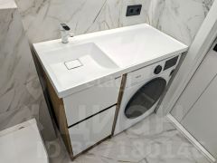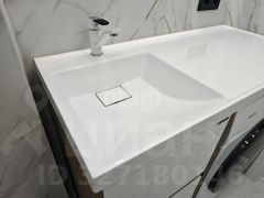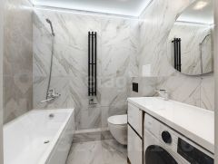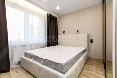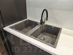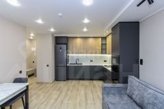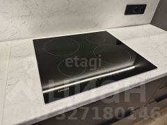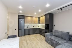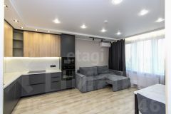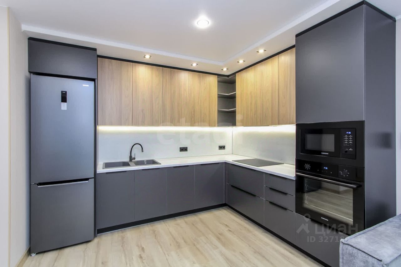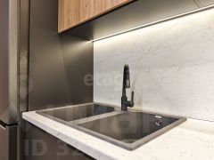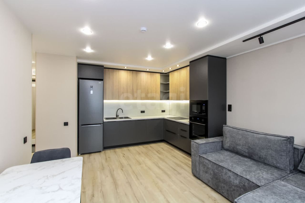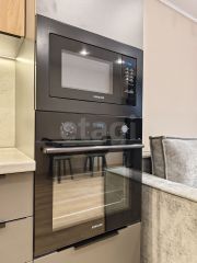 Квартира оборудована современным кухонным гарнитуром со встроенной бытовой техникой и стильной мебелью.
